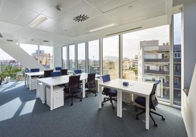 Edificio sostenible de 5.745m2 con 3 plantas, Terraza y 753 puestos de trabajo, oficinas privadas, salas de reuniones y formación, auditorio, zona Office Club,  y más.