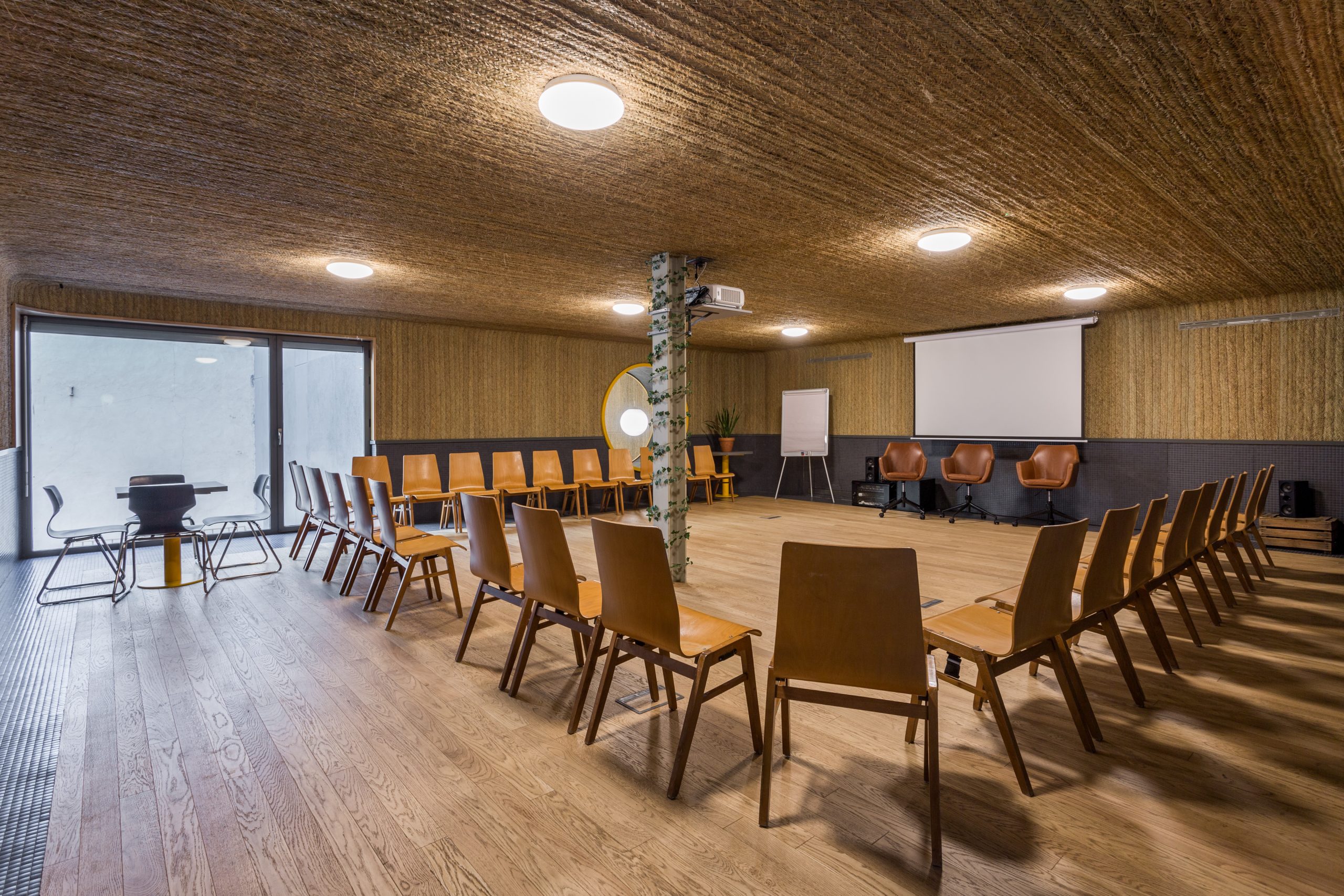 Situada en la entreplanta, con dos ventanas de ojo de buey sobre el Auditorio y dos ventanales a ambos patios interiores, es un espacio ideal para pequeños eventos: convocatorias de prensa, reuniones, formaciones, etc. Sus paredes están forradas de esparto lo que aporta calidez al entorno. Podrás disponer de mobiliario y servicios adicionales para hacer que tu evento sea todo un éxito.