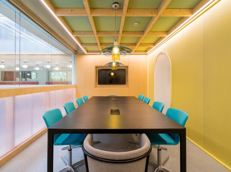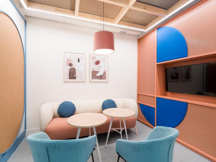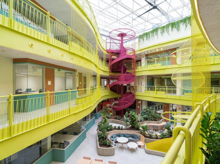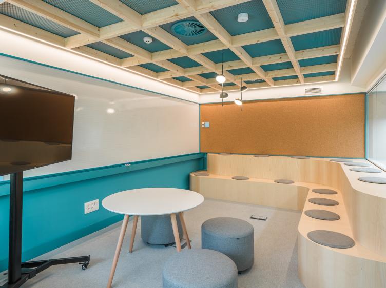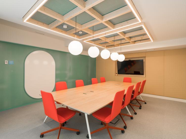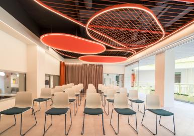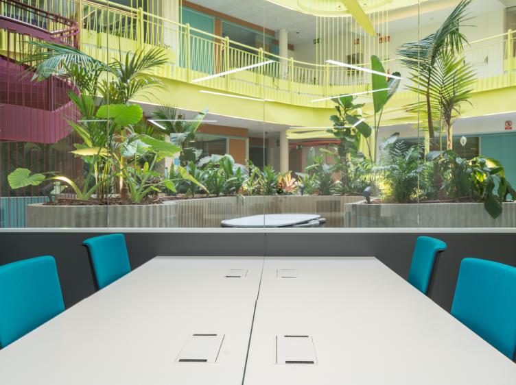 Edificio sostenible de 5.745m2 con 3 plantas, Terraza y 753 puestos de trabajo, oficinas privadas, salas de reuniones y formación, auditorio, zona Office Club, y más.